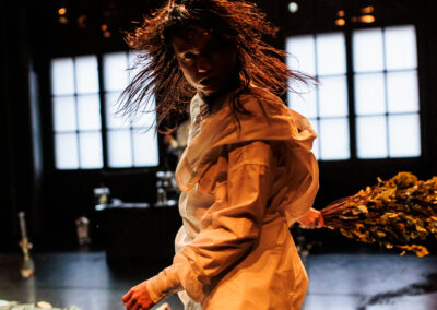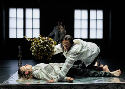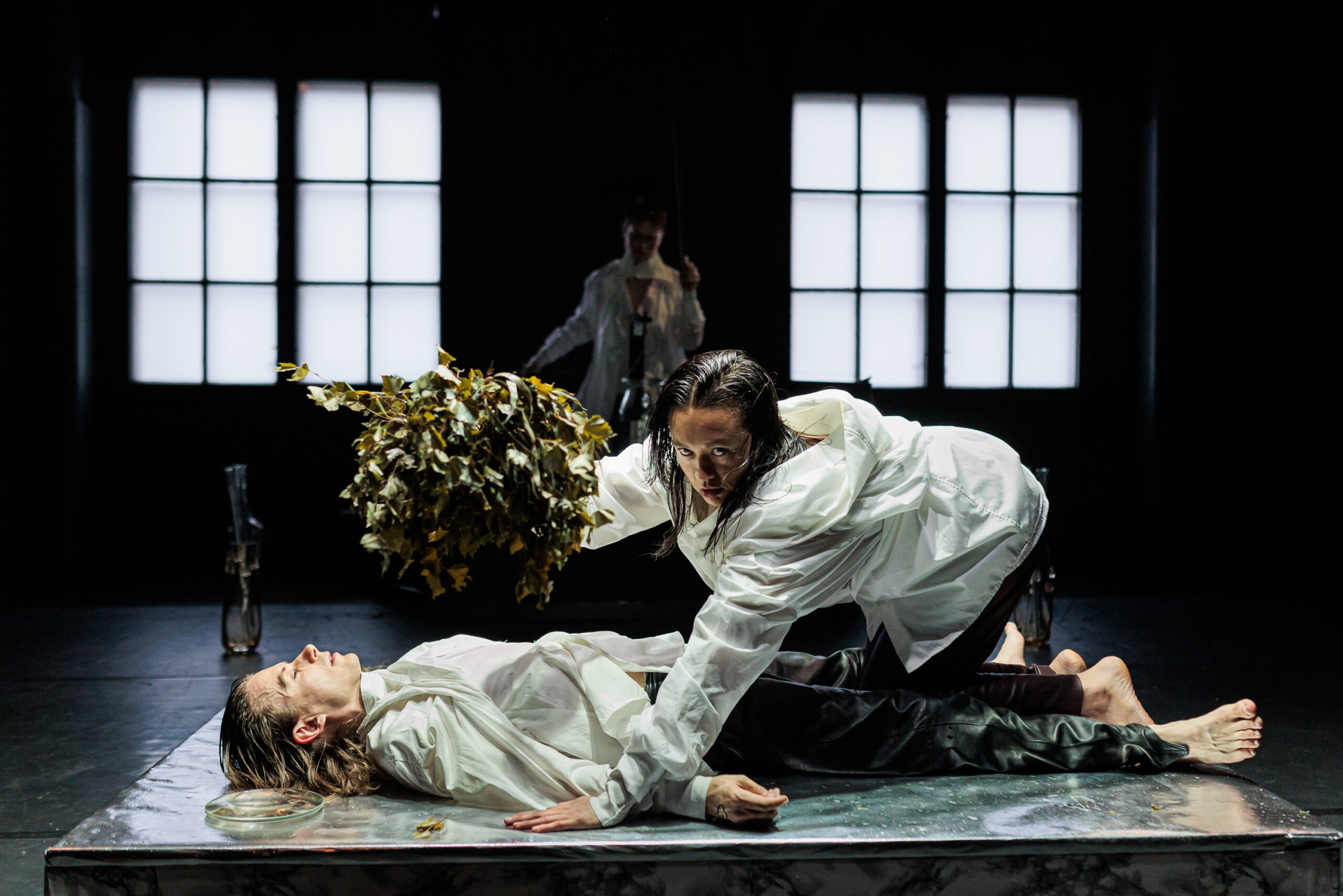Visually, Glass Eyes transforms the stage into a mash-up of an anatomical theatre and a ritual site. Sofia Palillo’s spatial and lighting design, with its use of glass elements, conjures images of laboratory equipment, organic fluids and fragmented body parts. Siru Kosonen’s costume design interacts with the space and highlights the materiality of the performing bodies. On stage, performers Marika Peura and Mikko Niemistö join musician Elias Riipinen, whose autopsy of the violin oscillates between symphonic reverence and raw, tearing noise.